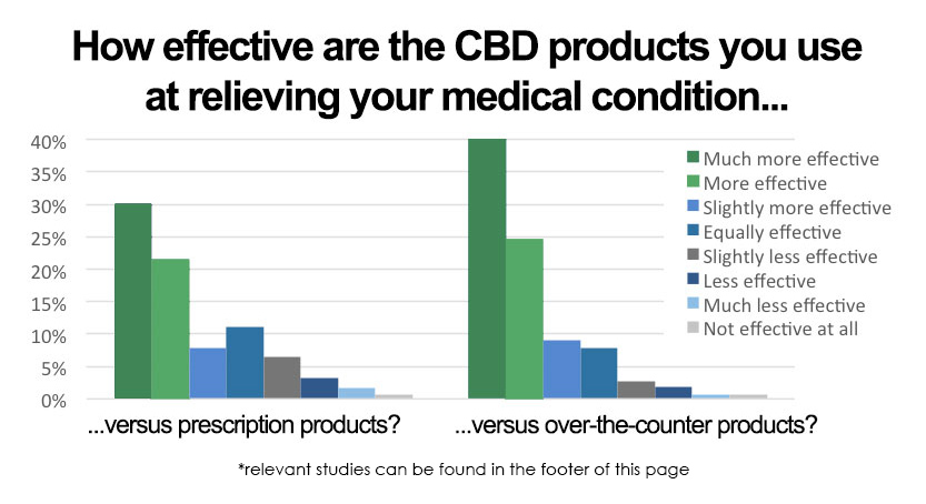 In fact, a recent study revealed that 60% of users say CBD is “more effective than prescription medications.75% found CBD more effective than over-the-counter products, as you can see below: